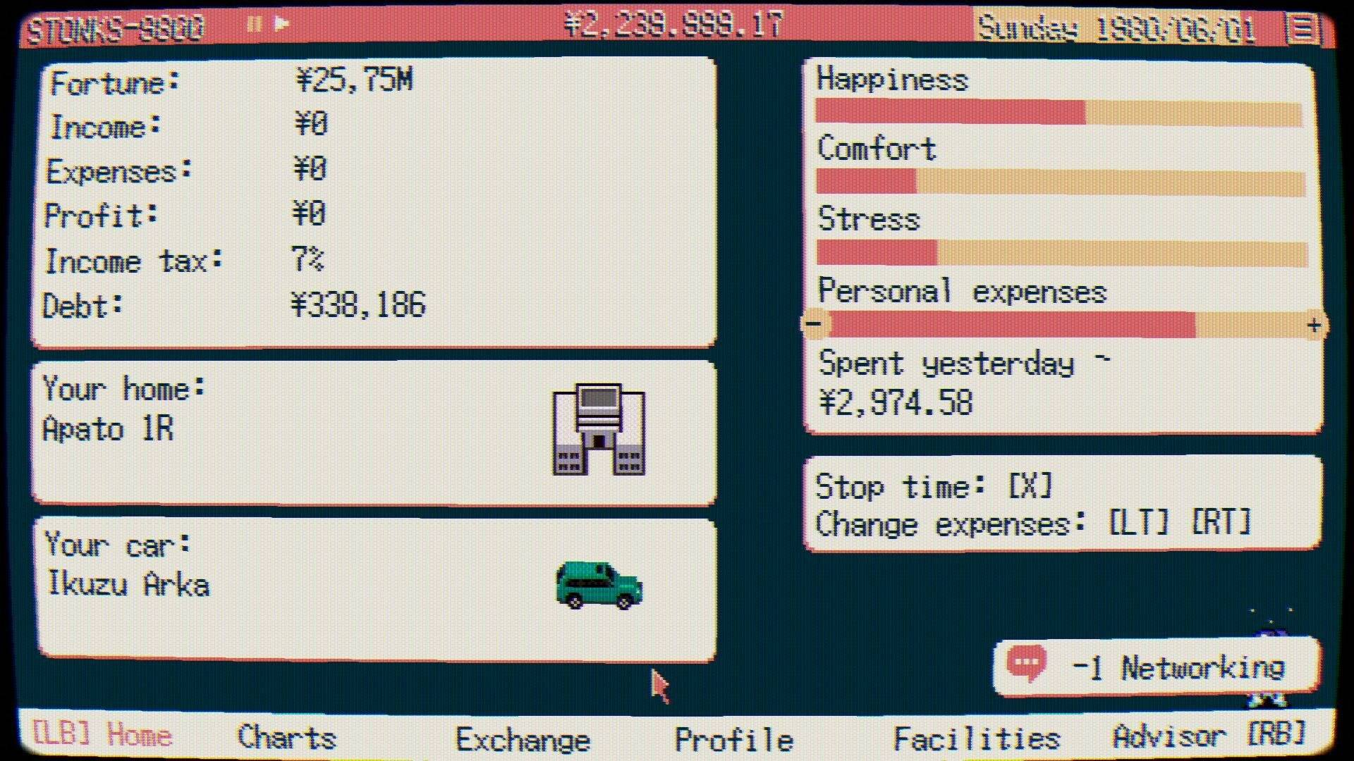 STONS-9800 — это текстовый симулятор бизнесмена, погружающий игроков в атмосферу японской фондовой биржи 80-90-х годов. Игра сочетает элементы стратегии, управления временем и случайных событий, создавая уникальный ретро-ландшафт экономической деятельности.